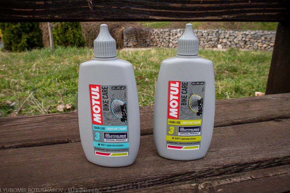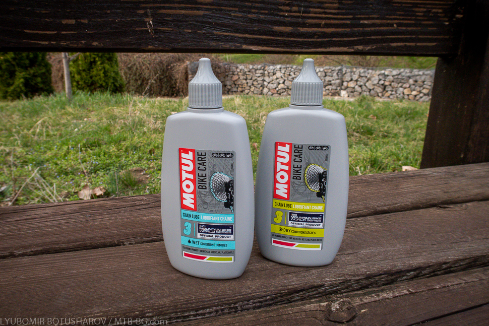 Нека започна с „теорията“, т.е. с това, което самият производител е дал като описание за продуктите. И двете смазки MOTUL Chain Lube са течни, тип масло, и са с цена 22 лв./11.25 евро за опаковка с обем 100 мл. Както личи от допълненията към името им, едната формула е подходяща за сухо време (Dry), а другата за мокро (Wet). Разликата между тях е, че „сухата“ смазка е оптимизирана да не „лепи“ прах, а „мократа“ да отблъсква ефективно водата и да се задържа максимално дълго върху триещите се повърхности, предотвратявайки корозията. Иначе и двете смазки са разработени на основаната на естери – химични съединения, които в случая са с оптимизирана поляризация и по този начин биват привлечени от стоманените повърхности, т.е. може да се каже, че маслото буквално „полепва“ по веригата. Формулата на препаратите включва и борен нитрид – керамична добавка, която увеличава издръжливостта и износоустойчивостта на маслото и намазаните с него повърхности. На някои опаковки може да видите логото на Тур дьо Франс, на други това на UCI Mountain Bike World Series, защото смазките са официален смазочен продукт и за двете вериги състезания. Не съм сигурен дали има някаква разлика в съставките между „шосейните“ и „планинските“ смазки, но аз пробвах „планинските“.