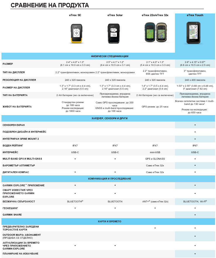 Сравнение между новите уреди в серията eTrex, както и с по-старите eTrex 22x/32x, може да видите тук: