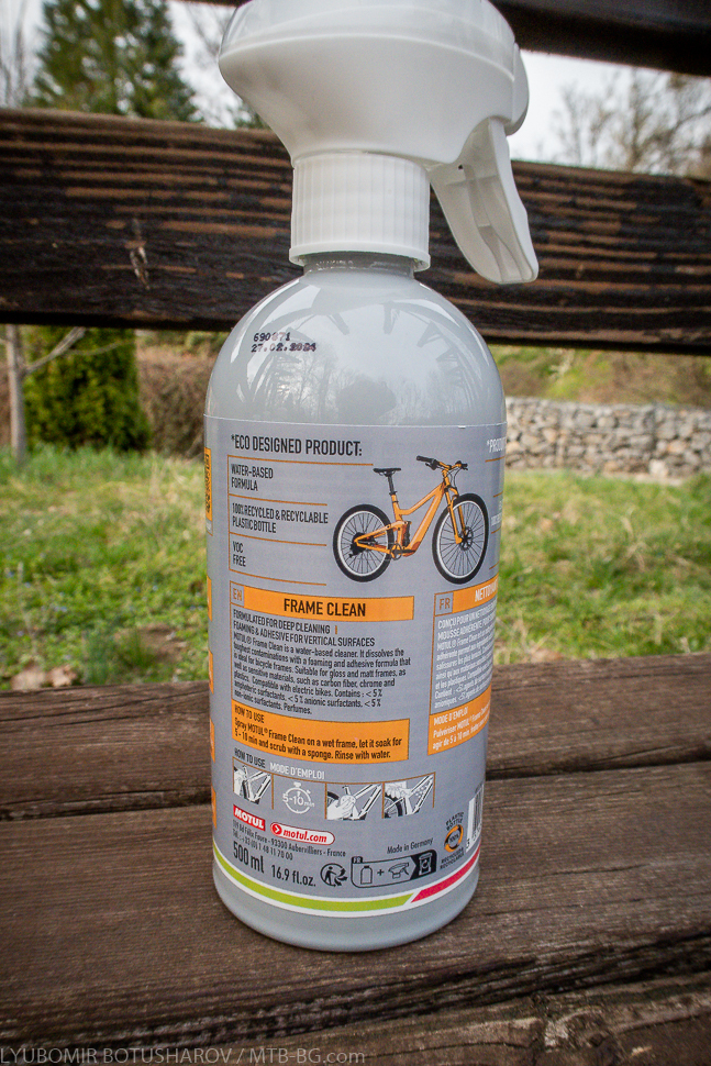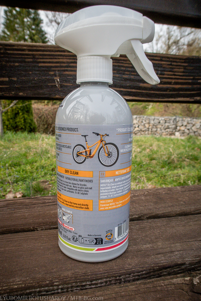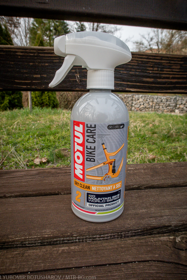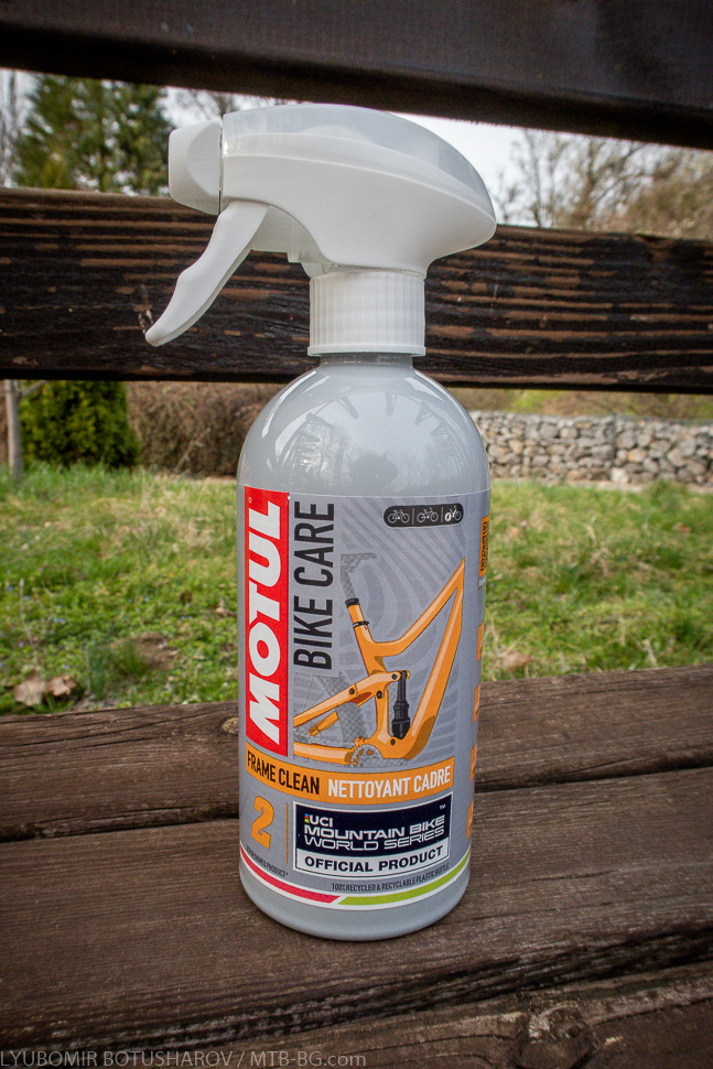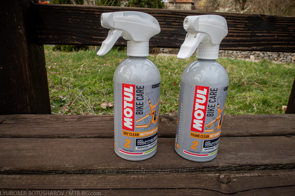 Между другото, и двата продукта – Frame Clean и Dry Clean – се предлагат във варианти за пресечен терен (с логото на UCI Mountain Bike World Series) и за шосе (с логото на Тур дьо Франс). Както споменах в статията за смазките, Motul е официален доставчик на такива продукти за тези състезания, оттам и логата върху опаковките. Дали има разлика в състава на продуктите обаче не мога да кажа – аз ползвах тези от планинската серия.