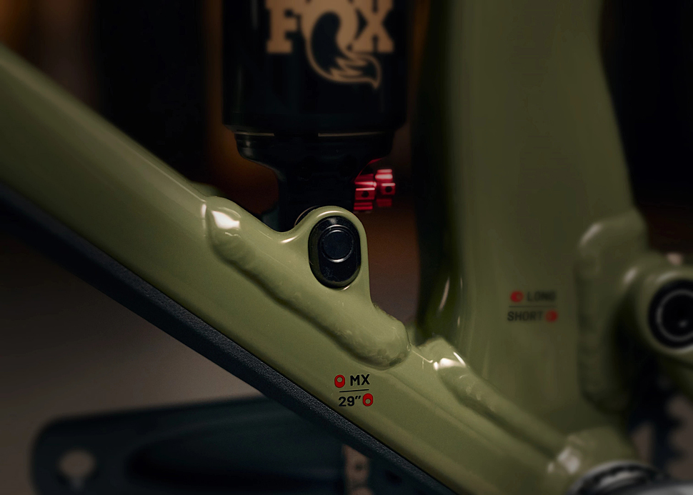 Като стана дума за предно и задно колела, можете да карате Spartan както в смесена конфигурация (29/27.5), така и изцяло като 29-ка. За целта при долния захват на шока има обръщаем чип и това е само една от възможните настройки. Можете също така да променяте дължината на задницата с +/-7 мм, като при различните размери на рамката тя е и с различна базова дължина.