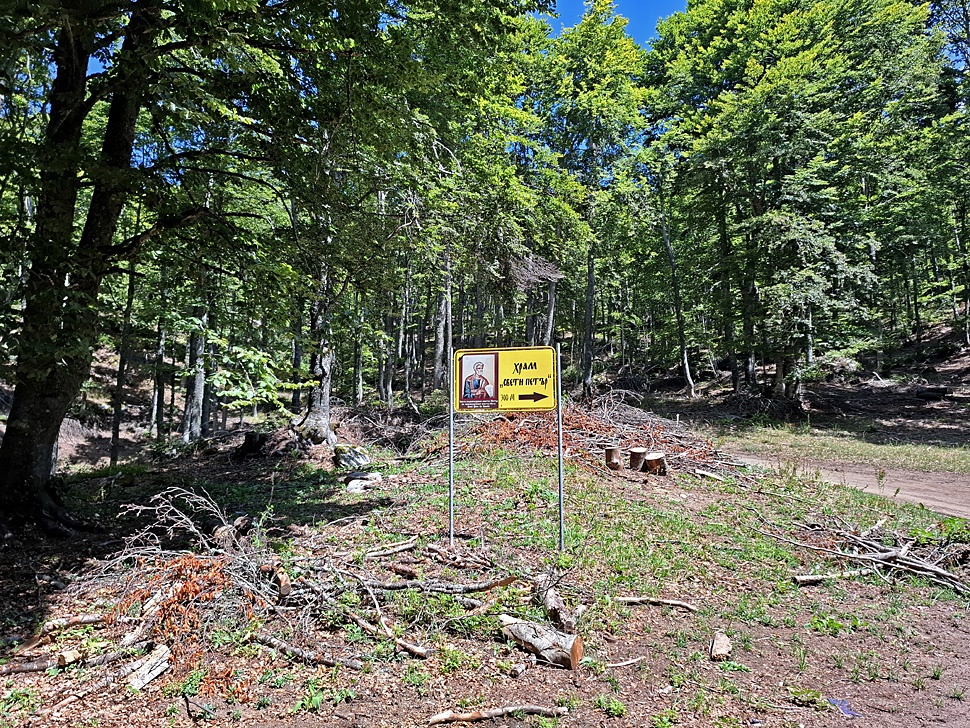 В подножието на върха стигаме до поляна, на която през лятото на 2025 г. се строеше малък навес с каптирана вода. Тук решаваме дали да изкачим върха (който е близо, би трябвало да е панорамен и да си струва), но подходът е стръмен, или да завием надясно през папратите и да започнем спускането по пътеката, без да се изкачваме повече (както направих аз).
