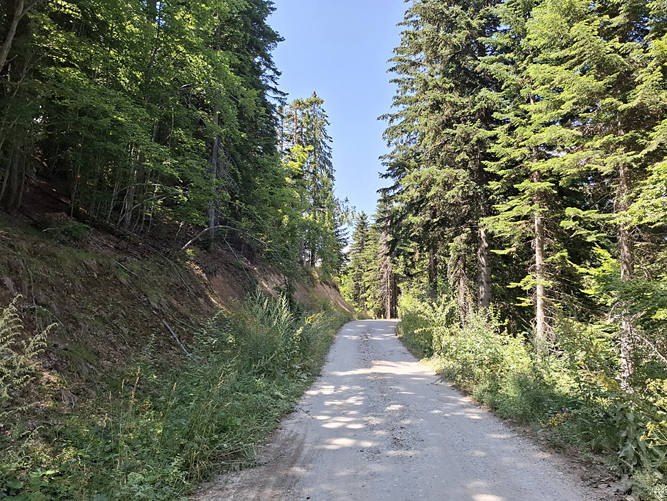 Продължаваме да караме през иглолистните гори, следвайки маркировката на Е4 , дори когато има по-широки пътища в друга посока. На места пътят е силно изровен и непрекъснато набиращ височина, като се наложиха и няколко кратки бутания. Подминава се голям разклон, на който се продължава вляво, като вярната посока е обозначена.