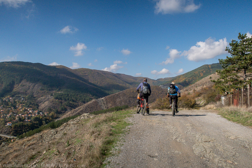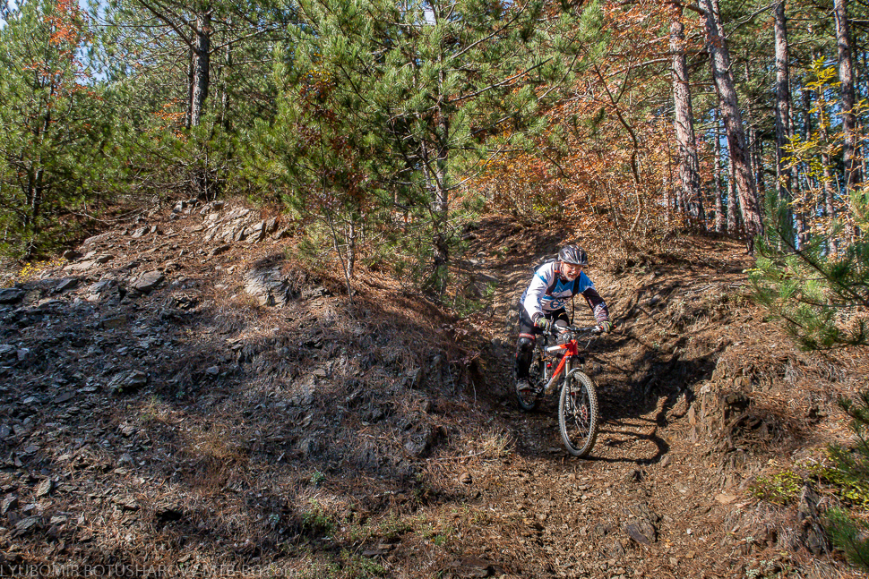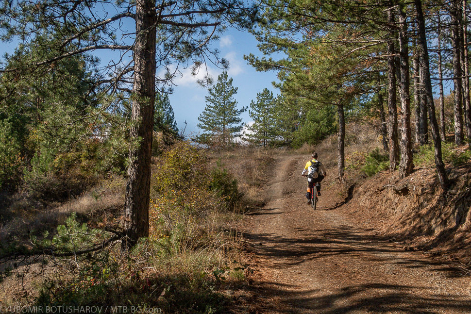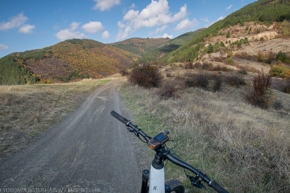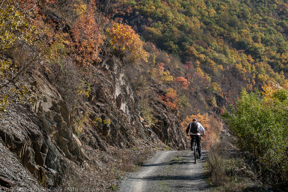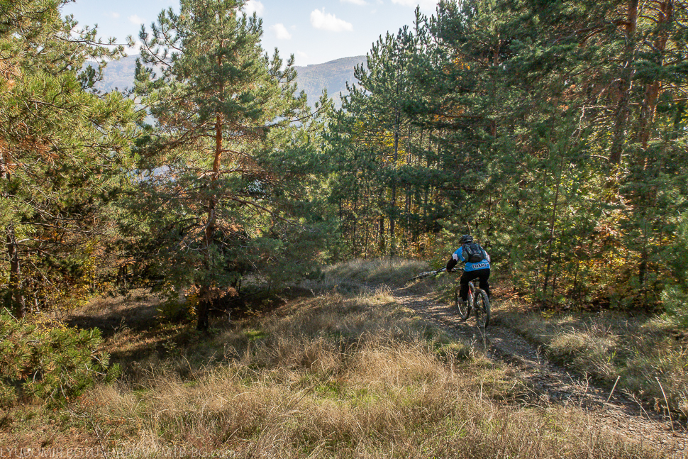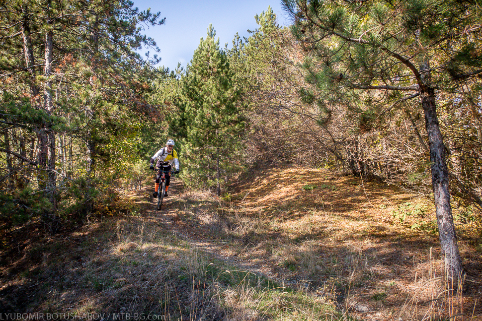 И така, в т.18, ако носите допълнителна защитна екипировка, сложете я и поемете надясно по стария черен път. След 100-200 м, в т.19, пътят завива надясно, а вие трябва да продължите по тясна пътечка леко вляво през ливадите. След малко тя навлиза в гората и става по-ясна и на места по-широка, но на други си е леко обрасла. В т.20 пресичаме още един занемарен черен път и оттам надолу вече няма разклонения и кръстовища. Пътеката върви почти право надолу по склона. На някои места е по-стръмна и технична, на други наклонът е среден. Като цяло няма някакви големи изненади, но видимостта не е добра, така че карайте внимателно! В края има един доста техничен скалист участък. След него пресичаме черен път (т.21) и малко по-надолу се изсипваме на една улица в с. Реброво – в т.22. Поемаме по нея наляво, след това в т.23 надясно и се спускаме до главния път през дефилето (т.24). Пресичаме шосето с повишено внимание и започваме спускане по него наляво към долината на р. Искър.