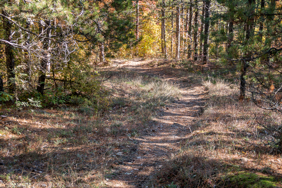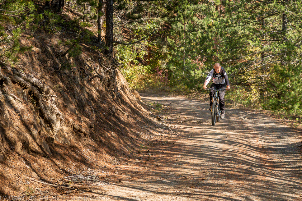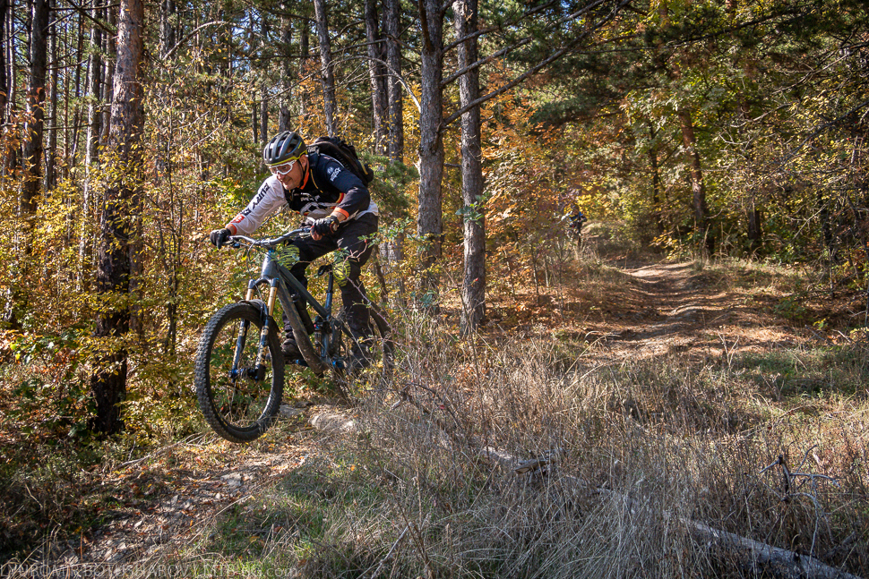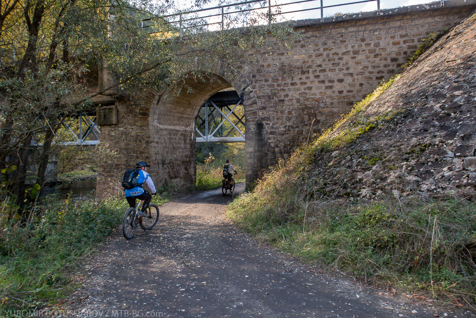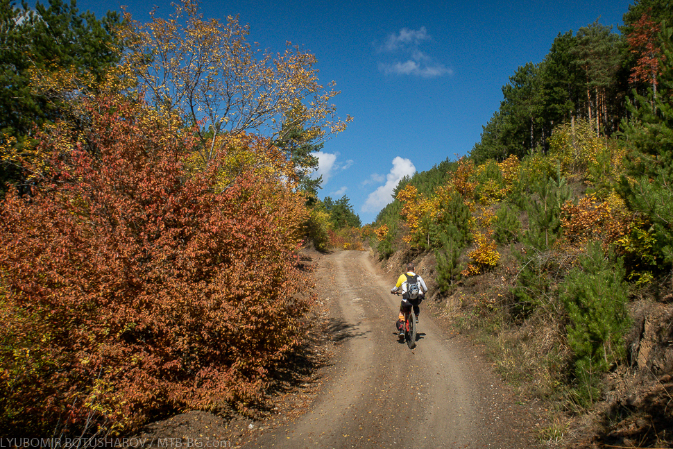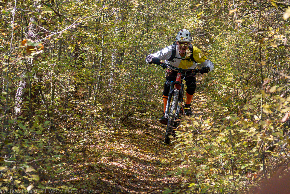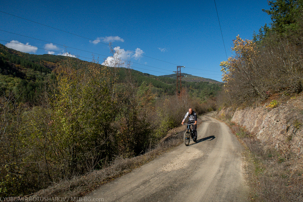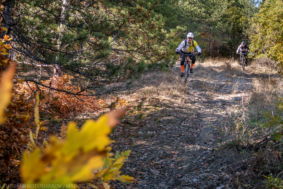 И така, в т.18, ако носите допълнителна защитна екипировка, сложете я и поемете надясно по стария черен път. След 100-200 м, в т.19, пътят завива надясно, а вие трябва да продължите по тясна пътечка леко вляво през ливадите. След малко тя навлиза в гората и става по-ясна и на места по-широка, но на други си е леко обрасла. В т.20 пресичаме още един занемарен черен път и оттам надолу вече няма разклонения и кръстовища. Пътеката върви почти право надолу по склона. На някои места е по-стръмна и технична, на други наклонът е среден. Като цяло няма някакви големи изненади, но видимостта не е добра, така че карайте внимателно! В края има един доста техничен скалист участък. След него пресичаме черен път (т.21) и малко по-надолу се изсипваме на една улица в с. Реброво – в т.22. Поемаме по нея наляво, след това в т.23 надясно и се спускаме до главния път през дефилето (т.24). Пресичаме шосето с повишено внимание и започваме спускане по него наляво към долината на р. Искър.